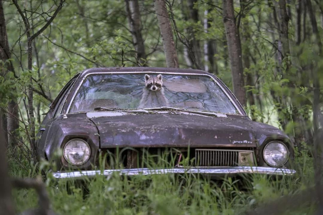 傍晚時分,在加拿大薩斯喀徹溫省的一個廢棄農場里,一只浣熊將頭從一輛二十世紀七十年代福特的擋風玻璃的碎洞中探出,而后座上正坐著它五個興奮的孩子。這位浣熊母親將頭探出后,仔細觀察了周圍環境很久,在確定安全以后,它趁著夜色鉆出了這輛車去為孩子們尋找食物。