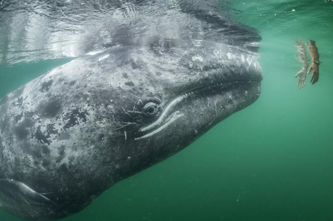 一頭好奇的灰鯨正在游向一位游客從水面游覽艇上伸下來的手。墨西哥下加利福尼亞半島中部地區圣伊格納西奧湖,灰鯨母親和她們的孩子們都會很積極的尋求和人類的接觸,讓人們撓一下自己的頭或者后背。
