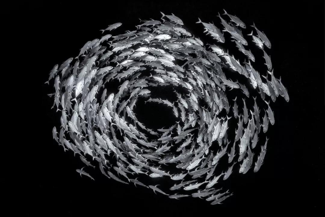 一大群六帶鲹在水里組成了環狀,它們這一行為是交配前的約會練習,同時還可以威嚇一下潛在捕食者。像這樣的聚會產卵很容易被捕漁者一鍋端,但幸運的是,這群魚生活在紅海禁止捕漁的海洋保護區域內。