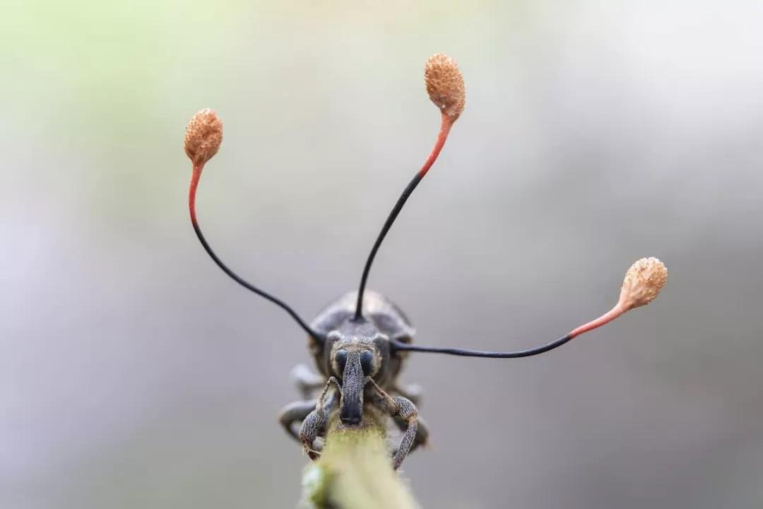 攝影師 Frank 在夜探秘魯亞馬遜熱帶雨林時,發現了這只緊緊抓著蕨類植物根部,長相奇異的象鼻蟲。它呆滯的眼睛顯示著它已經死亡了,而從它軀干上長出的三根觸角一樣的東西則是一種寄生在象鼻蟲身上的真菌。