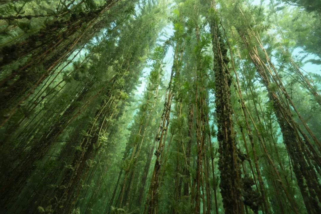 在他貼著水面游動的時候,他突然發現一個巨大的長矛消失在下面的雜草中。他向下游去,游近了才發現自己仿佛置身于一個水下叢林中, Michel 用廣角構圖的方式營造出一種置身于參天大樹的森林中,從地面向上凝視的感覺。