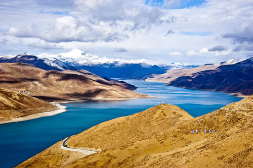 這里是俯瞰羊卓雍措湖的最佳地點:山頂上有云層覆蓋,在湖面投下巨大的不規則身影。蔚藍的天空與湖水相映。純凈的湖水在陽光下呈現深淺不同的藍色:淺藍、深藍、孔雀藍,還有一些是綠色的。平靜的湖面皺起魚鱗般的細小波浪,那一汪碧水是如此地深邃,奪人魂魄。