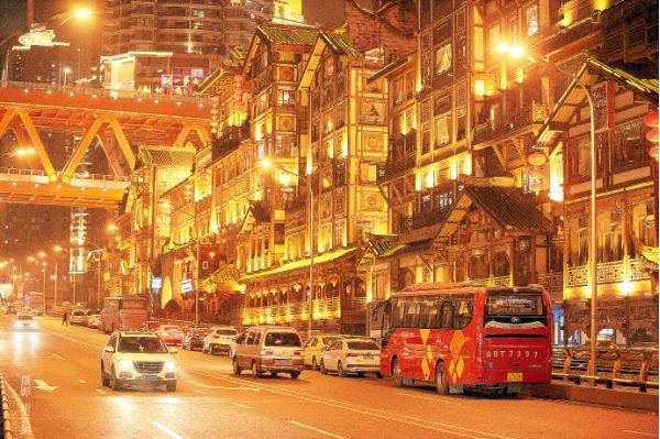 洪崖洞:江景和城市風(fēng)貌完美融合,以75米高的超常落差,順崖而上,高低錯(cuò)落、依山而建,成為備受世界矚目的,獨(dú)特靚麗的城市名片。坐擁城市旅游景觀、商務(wù)休閑景觀和城市??景觀于?體。 以具巴渝傳統(tǒng)建筑特?的"吊腳樓"風(fēng)貌為主體,依山就勢,沿江而建,魔幻的退臺和高差、流光溢彩的夜景,讓游客嘆為觀止。