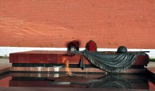 【無名英雄紀念碑】(不少于 10 分鐘)它建成于 1962 年衛國戰爭勝利紀念日前夕,正面朝北、東西走向的深紅色大理石陵墓上,稍靠西側陳設著鋼盔和軍旗的青銅雕塑,造型簡潔明快,蘊意肅穆深長,墓前有一個凸型五星狀的火炬,五星中央噴出的火焰,從建成時一直燃燒到現在,從未熄滅,是俄羅斯婦孺皆知的“全國第一崗”;