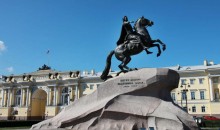 【十二月黨人廣場】【青銅騎士像】 (約 20 分鐘)紀念十二月革命中犧牲的十二月黨人以他們名字命名;青銅騎士雕塑由普希金的抒情詩而得名的,是圣彼得堡市標志性建筑之一,按照另一位俄國大帝葉卡捷琳娜二世的吩咐制作的,法國著名雕塑家法爾科內辛勤工作了 12 年完成了這一藝術杰作,銅像被安置在一塊重達 1600 噸的天然巨石上,頭戴冠的彼得大帝穩騎在前蹄騰起的駿馬上,顯示出了所向無敵的風采;
