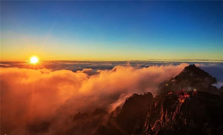 在黃山,有一種絕景,那就是日出和日落時伴跟著云海的呈現,被稱作“霞海”或“霞鋪云”——或凝重或翻騰或縹緲的云海在霞光的映襯下,霞光萬道,照射在云海之上,色彩斑瀾,華光燦艷,涌金流銀,形成黃山奇奧的“霞鋪云”奇景。秋日,是黃山呈現霞鋪云概率較高的季節,是以秋游黃山的人們必然要抓住機緣,若能有一次不雅鑒賞“霞鋪云”奇景的機緣,必然會使您的黃山之旅加倍難忘。