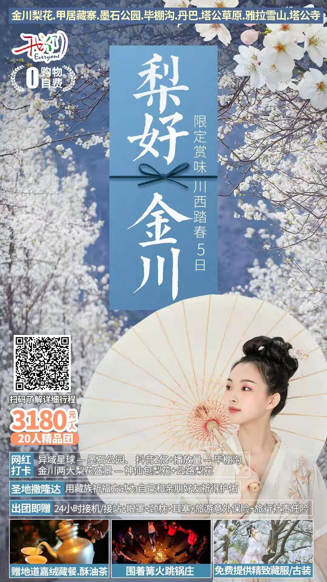 我們的團期是金川最好的時節(jié),萬物復蘇的初春三月,正值金川成千上萬棵梨樹花期,雪白色的梨花競相開放,一片片、一層層的鋪散開來,漫山遍野的白色花海中夾雜零星新綠,空氣中氤氳著梨花清香,眼是天堂,身亦是天堂。