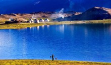 揭開帕米爾高原情結(jié),三大冰峰(公格爾峰、公格爾久別峰、慕士塔格冰峰)雄偉壯觀。世界聞名的冰山之父慕士塔格峰(7546M)下的【卡拉庫里湖】,意為“黑海”,海拔3600米,是面積十余平方公里的高山冰蝕冰磧湖湖泊卡拉庫里湖,水面映襯著巍峨又神秘的慕士塔格峰,白雪皚皚,山水同色,景色十分迷人。湖畔的蘇巴什草原上水草豐茂,牛 羊成群。有塔吉克人的氈房和木屋,還有專設(shè)的登山營地。