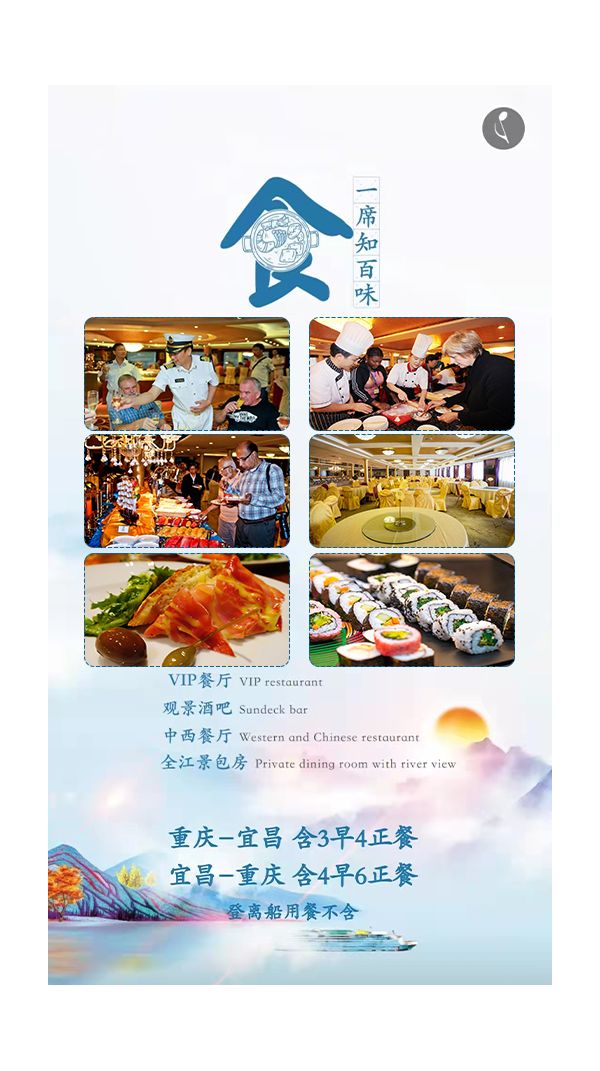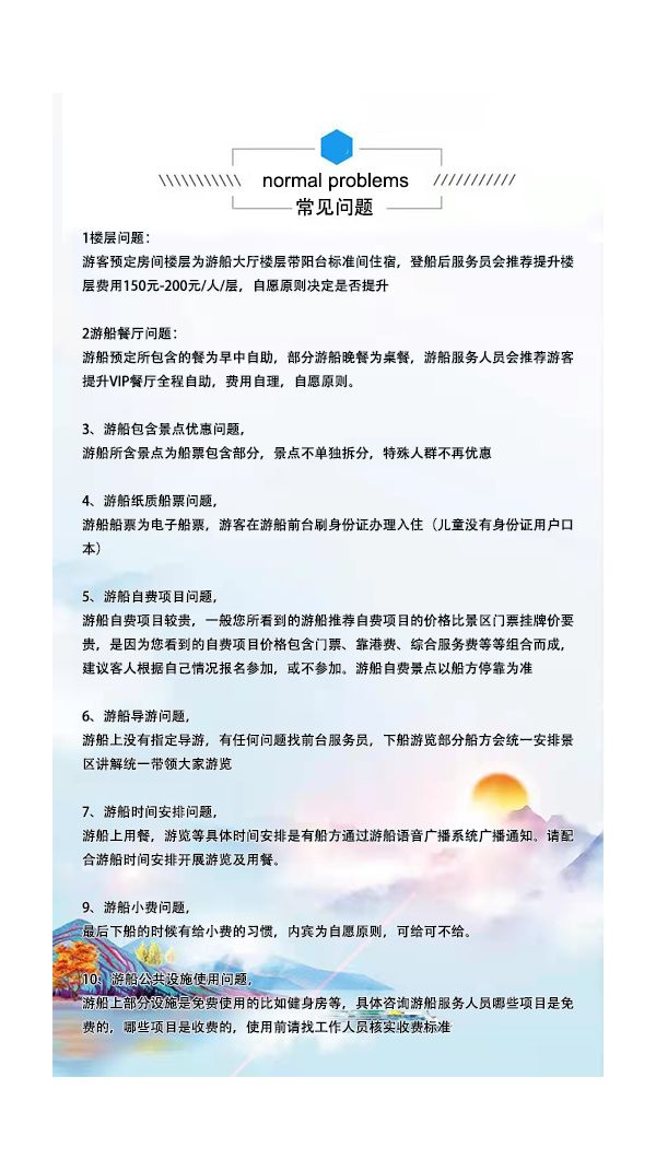 17:00——晚餐成人:不含餐 兒童:不含餐登船當日(大多數游船)晚餐不在船票所含安排之內,建議可晚餐后登船。 1、常規重慶登船為朝天門碼頭,然而朝天門碼頭又細分為十幾個小碼頭,游船停靠就類似于火車停靠站臺一個道理,游船具體停靠在朝天門的幾號碼頭以實際停靠為準,為了防止游船臨時變更停靠碼頭,造成走錯碼頭的情況出現,一般我們會在登船當天中午找游船前臺再次核實登船碼頭后中午12點前告知您具體朝天門幾號碼頭登船,建議您登船前可以撥打游船電話再次核實登船碼頭。