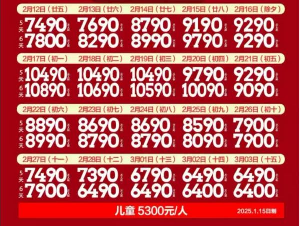 出團(tuán)日期:2月12日(廿五)?2月13日(廿六)2月14日(廿七)2月15日(廿八)2月16日(除夕?)? 2月17日(初一)2月18日(初二)2月19日(初三)2月20日(初四)2月21日(初五) ?2月22日(初六)2月23日(初七)2月24日(初八)2月25日(初九)2月26日(初十) ?2月27日(十一)2月28日(十二)3月01日(十三)3月02日(十四)3月03日(十五?)?