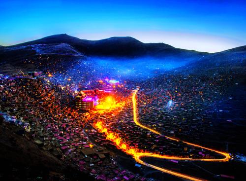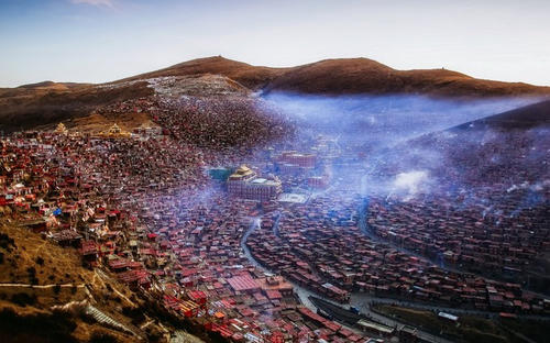 以佛學院的大經堂為中心,密密麻麻搭滿了四面的山坡,