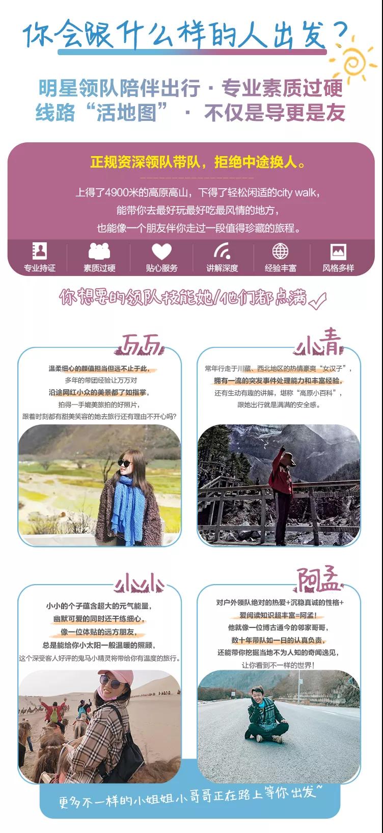 2、沿途系藏族聚居地區,請游客尊重當地宗教信仰、民俗民風,遵守景區規定。行程若存在景點需騎馬,為您的安全著想,騎馬必須由馬夫牽韁方能騎行,請勿獨自騎馬或騎馬奔跑,險路及下坡路必須下馬步行,否則造成的損傷,概由游客自行承擔。