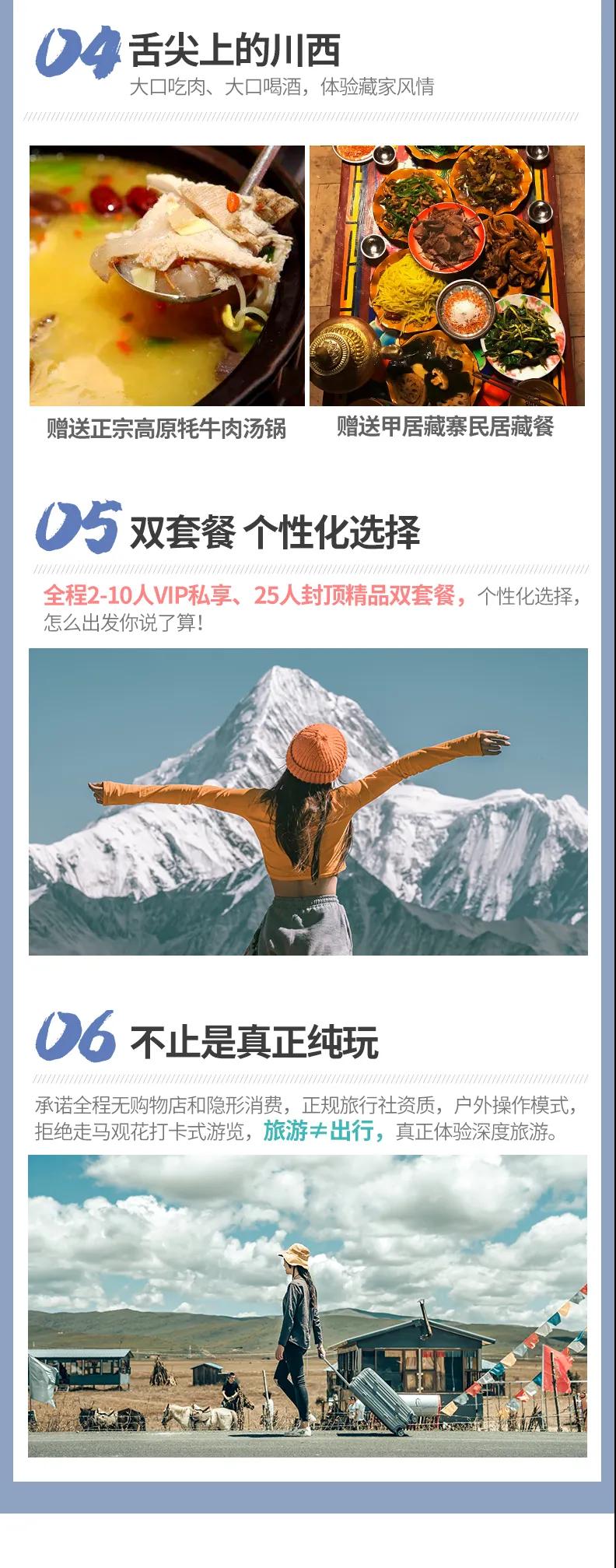3、禁忌:川西地區受宗教影響,風俗習慣有所不同,游覽時(如進寺廟),請謹記當地導游宣布的有關旅游注意事項,入鄉隨俗,在任何場合下都不要提及有關少數民族的政治問題。行程若存在景點需騎馬,為您的安全著想,騎馬必須由馬夫牽韁方能騎行,請勿獨自騎馬或騎馬奔跑,險路及下坡路必須下馬步行,否則造成的損傷,概由游客自行承擔。
