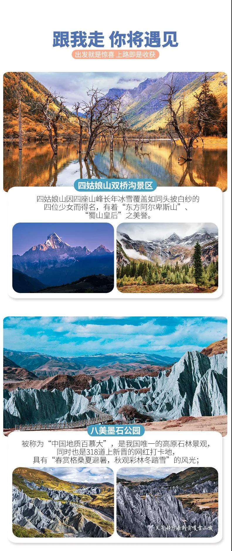 (3)如因道路維修或其他不可抗力因素,無法游覽四姑娘山雙橋溝景區,則調整為游覽【碧峰峽】景區,敬請諒解。