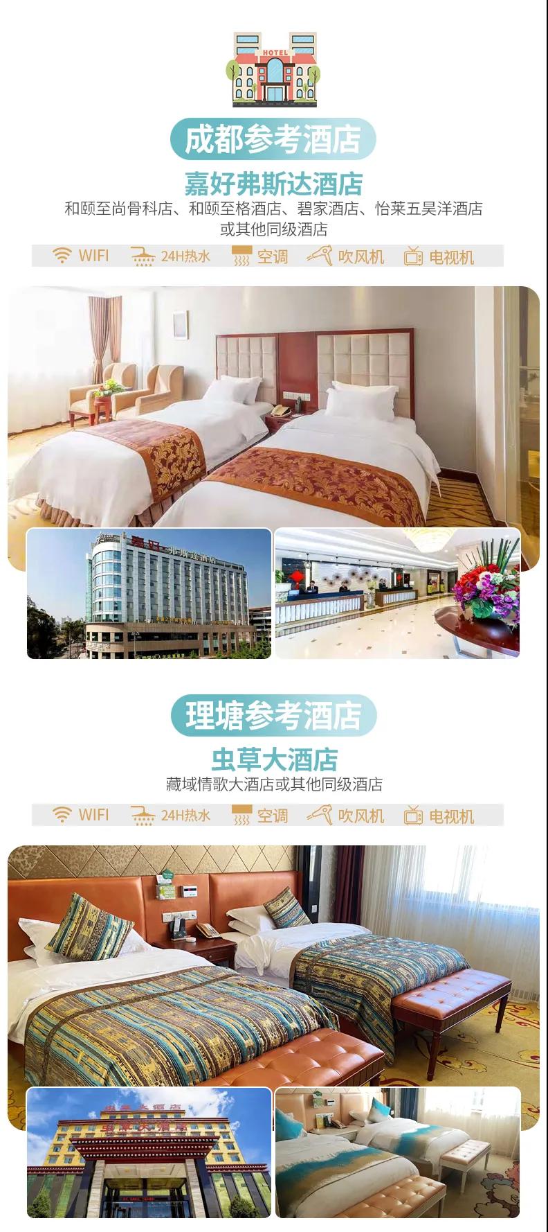 含全程6天5晚舒適酒店。我們反復踩點策劃了既能全景玩理塘又只需要入住一晚理塘,其他均是低海拔住宿,而且理塘我們特別安排了有氧地暖房,保證大家高原旅行的安全和行程體驗。參考酒店如下(僅供參考,實際以訂房為準):