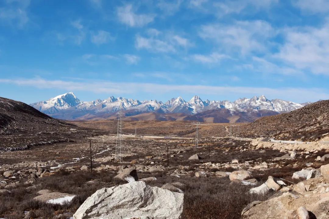 在從鐵匠山剛進入格聶山區時,格聶群峰橫陳天際,這是遠眺格聶群峰的最佳位置。在這里可以看到三座巨大的雪山從地平線上騰空而起,格聶、肖扎、喀麥隆、庫日崗中等數座神山從左向右一字排開,像一堵雪山屏障一樣,蔚為壯觀。