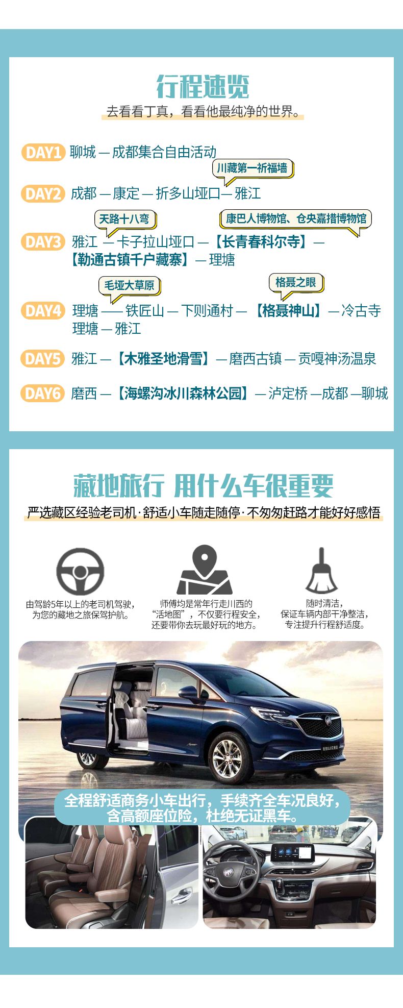 1、關于車輛交通:目前四川旅游市場8座以下車輛無法辦理旅游牌照,請游客知悉,以此理由提起的投訴我方拒不受理,望您諒解。