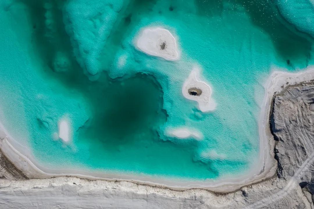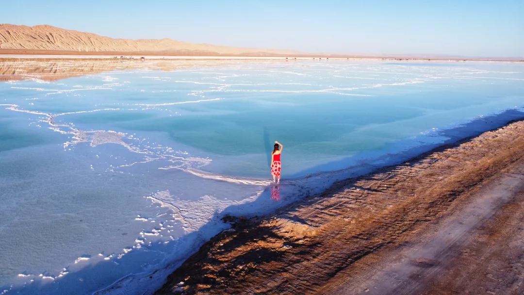在水上雅丹不遠處便是【東臺吉乃爾湖】。東臺吉乃爾湖被稱為“中國的馬爾代夫”,湖水呈現純正的蒂芙尼藍;乃爾湖岸邊盡是覆蓋著的白色結晶,湖周圍是大片的雅丹地貌,搭配上顏色干凈到極致的湖水、西北特有的廣闊無垠的天空,純粹而強烈的視覺沖擊,這方圓百里大漠戈壁無人區的珍寶明珠,這只屬于大自然的神秘顏色,讓你仿若來到了世界的盡頭,讓你感受一種歸于自然的內心平靜。
