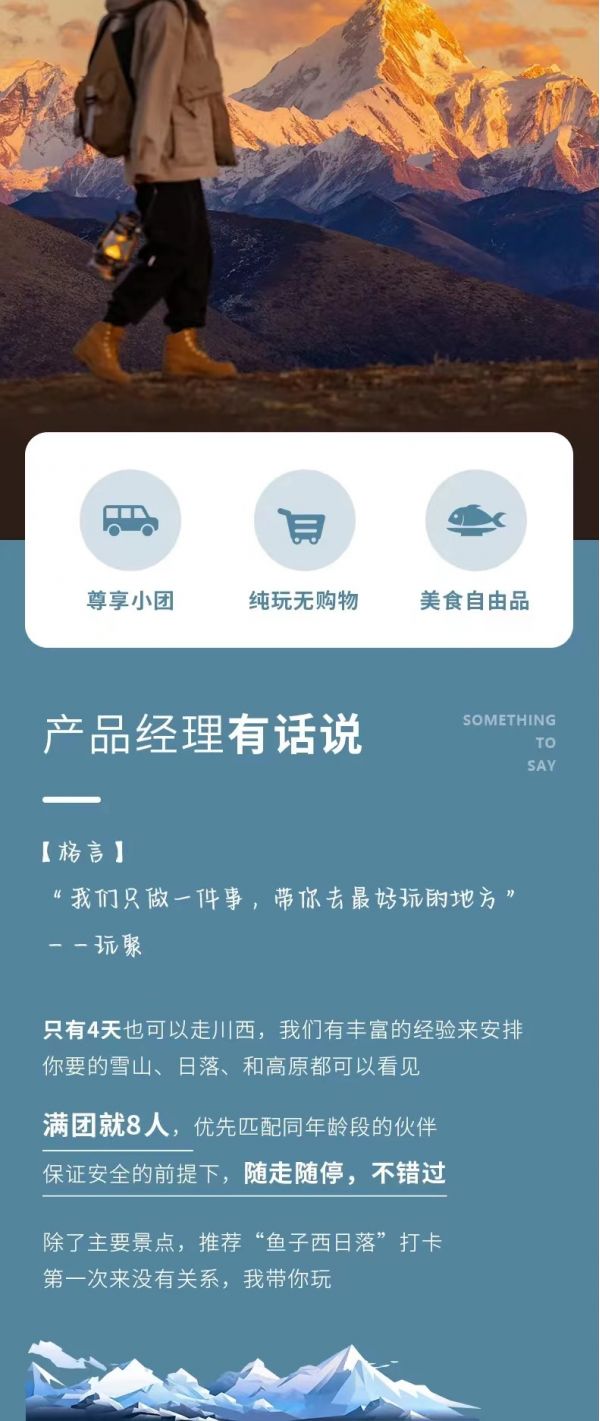 私人訂制:我們業務范圍囊括了全國各大城市,川西、西北、新疆、西藏,在路上永遠有我們的身影。我們將為每一個有定制需求的你策劃出獨屬于自己的完美旅行。