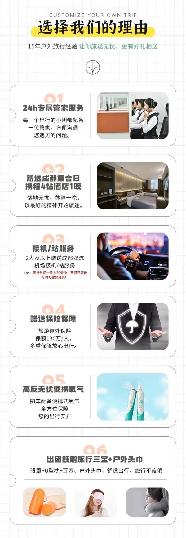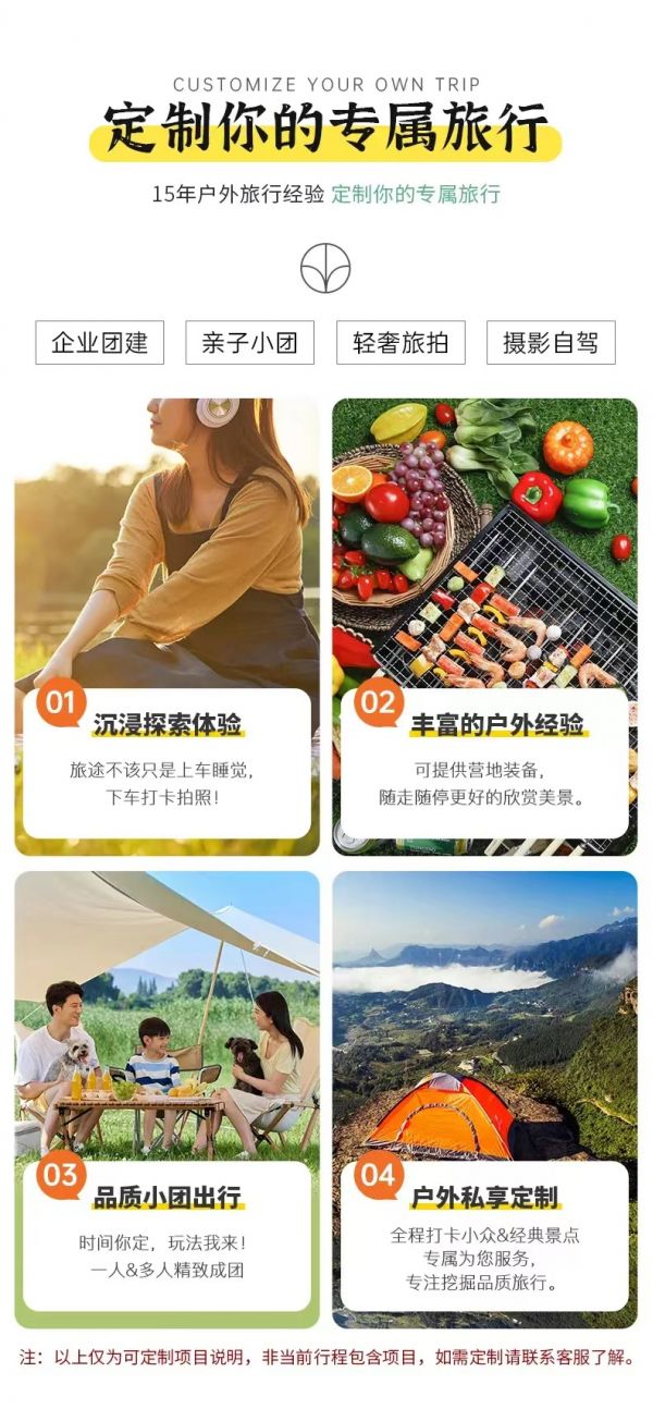 私人訂制:我們業務范圍囊括了全國各大城市,川西、西北、新疆,在路上永遠有我們的身影。我們將為每一個有定制需求的你策劃出獨屬于自己的完美旅行。