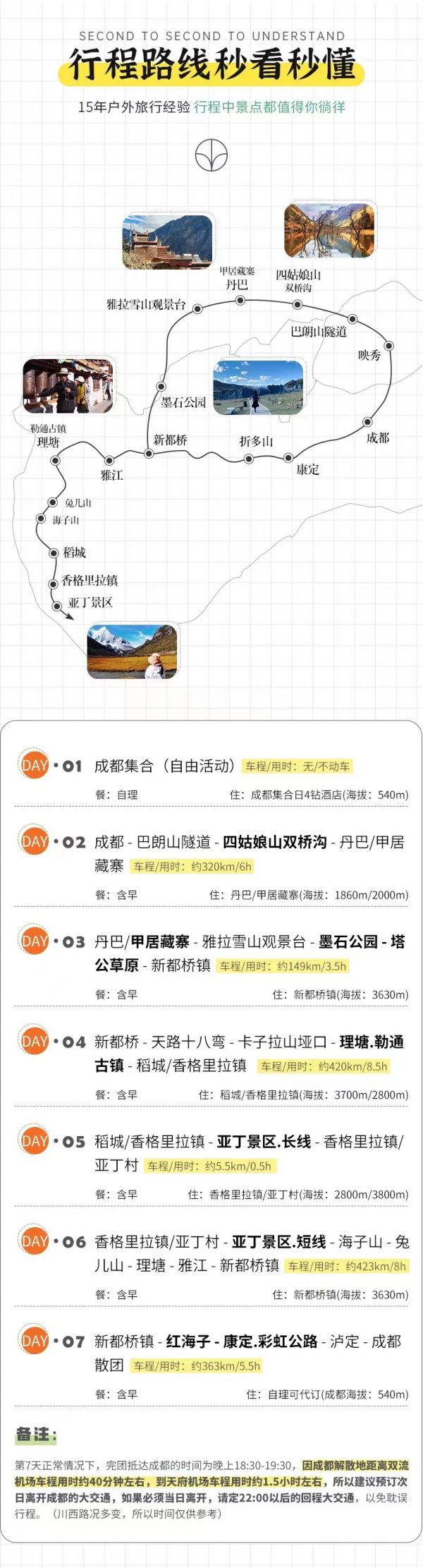 (1)以上行程時間安排可能會因天氣、路況等原因做相應調整,正常情況下完團回到成都時間為晚上18:30至19:30左右,如果必須當日離開,請定22:00以后的回程大交通,以免耽誤行程,敬請諒解;