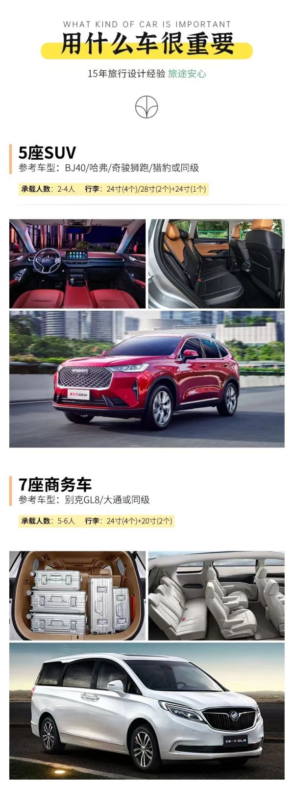 交通:VIP私享2-8人小團,全程商務車/SUV出行,保證一人一正座位,車型大小根據實際人數安排,且由駕駛經驗豐富的司機為您的出行保駕護航,報價包含車費、油費、停車費、維修費及司機勞務費。