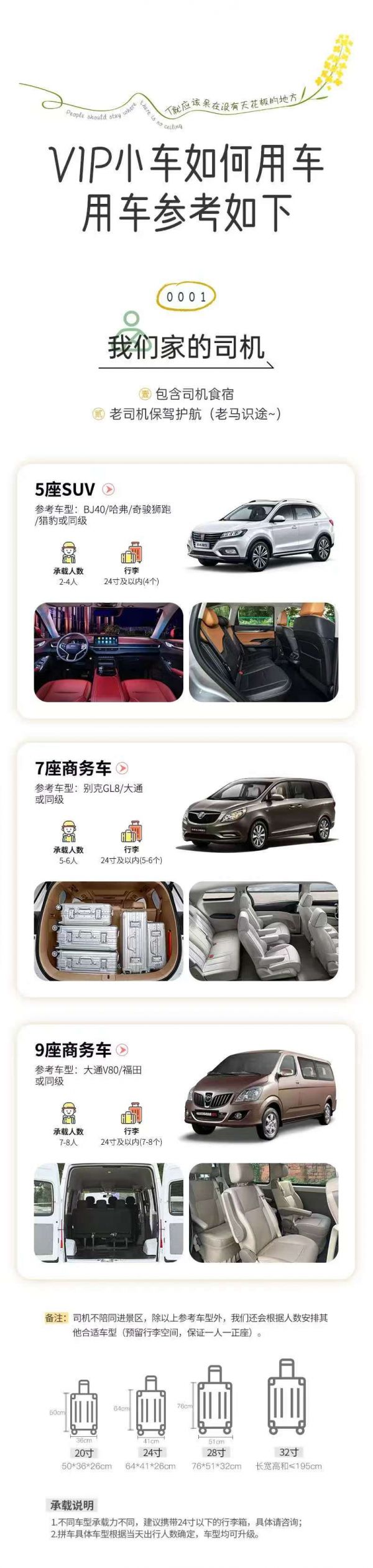 為保證成團(tuán)及質(zhì)量,根據(jù)人數(shù)派不同座位數(shù)用車,保證每人一正座;