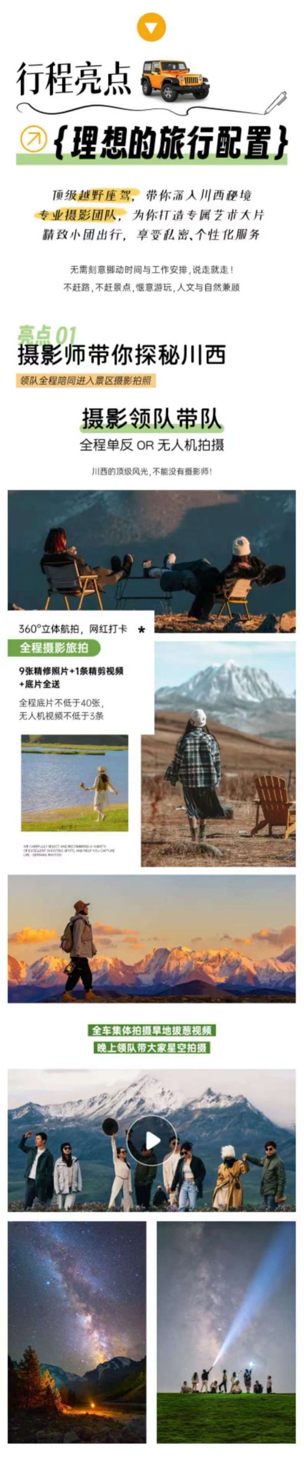 無人機+單反旅拍(底片全送+9張精修照片+1條精剪視頻),底片全程不低于40張,無人機視頻不低于3條(全車人拍攝旱地拔蔥視頻,晚上領隊帶大家星空拍攝);贈送藏服旅拍(6張底片+3張精修),全場衣服通選(除了三款羊皮襖)+精妝+精造;隨車便攜式氧氣瓶每人2瓶、旅行三寶1套/人、撒隆達1份;隨車配備礦泉水、急救包、指尖血氧儀;贈送特色土火鍋+篝火晚會+藏族歌舞表演晚會;可免費提供露營桌椅板凳爐具,可以野餐(食材車上游客一起AA),需提前預約;體驗藏區文化特色-畫唐卡;