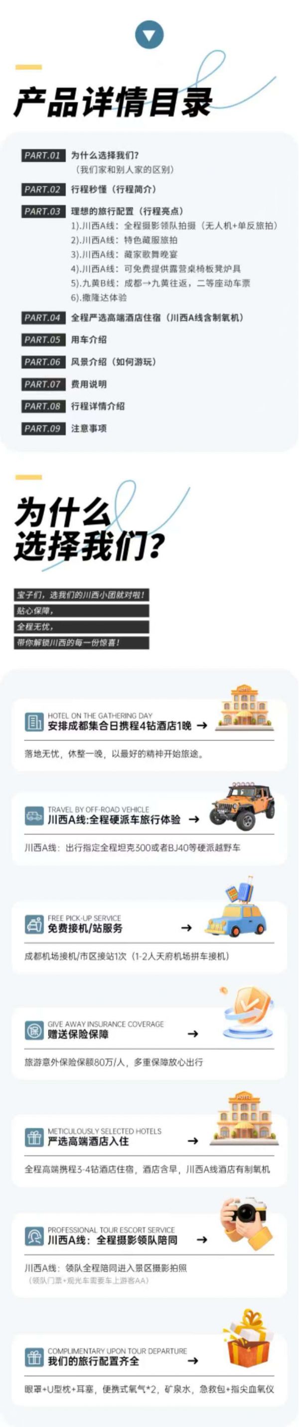 備注:以上項目僅限報名川西A線游客享有,報名九黃B線路游客不享受以上項目(川西A/B線包含如下:)包含成都機場接機/市區接站1次(1-2人天府機場拼車接機);包含80萬旅游意外險。