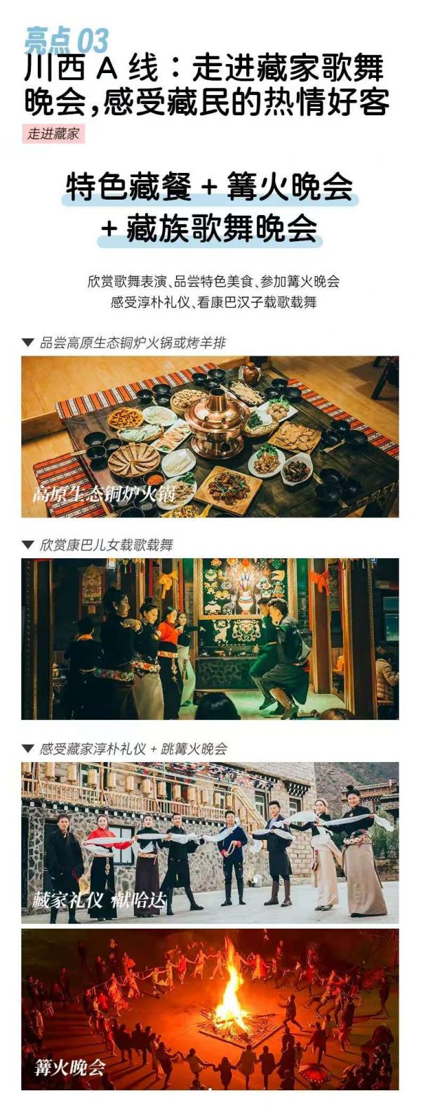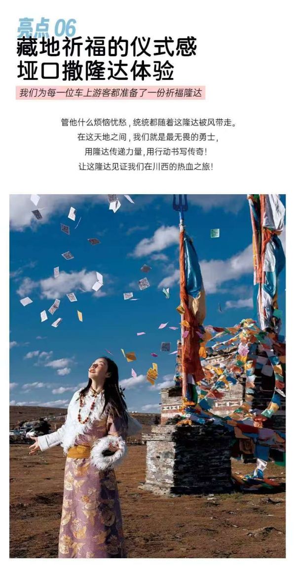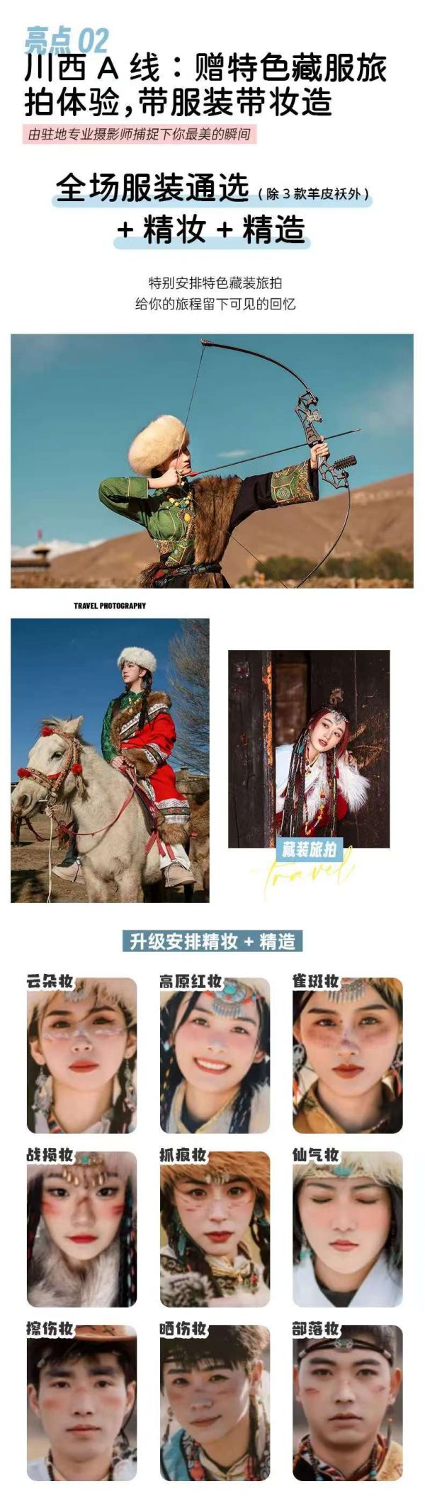 無人機+單反旅拍(底片全送+9張精修照片+1條精剪視頻),底片全程不低于40張,無人機視頻不低于3條(全車人拍攝旱地拔蔥視頻,晚上領隊帶大家星空拍攝);免費提供露營桌椅板凳爐具,可以野餐(食材車上游客一起AA),物資有限需提前預約;贈送藏服旅拍(6張底片+3張精修),全場衣服通選(除了三款羊皮襖)+精妝+精造;隨車便攜式氧氣瓶每人2瓶、旅行三寶1套/人、撒隆達1份;隨車配備礦泉水、急救包、指尖血氧儀;贈送特色土火鍋+篝火晚會+藏族歌舞表演晚會;