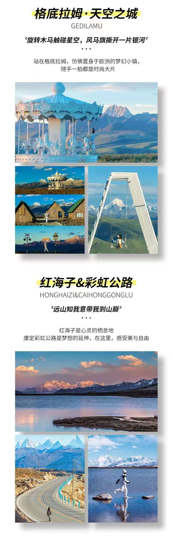 紅海子觀景臺(tái)和魚子西/格底拉姆/八郎生都的氣溫較低,要攜帶足夠的保暖衣物,如羽絨服、毛衣、圍巾等。在觀景臺(tái)拍照時(shí),注意安全,不要靠近懸崖邊緣或危險(xiǎn)區(qū)域。