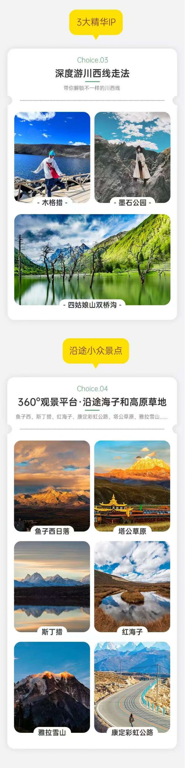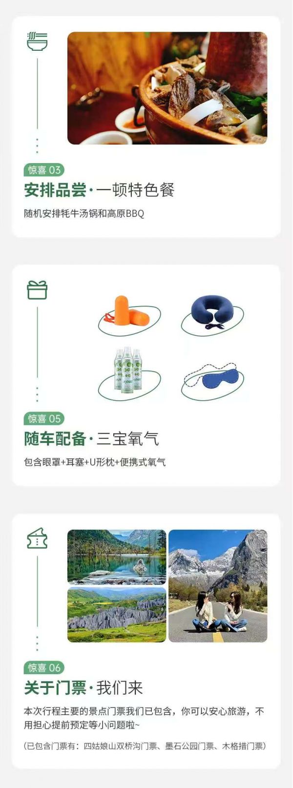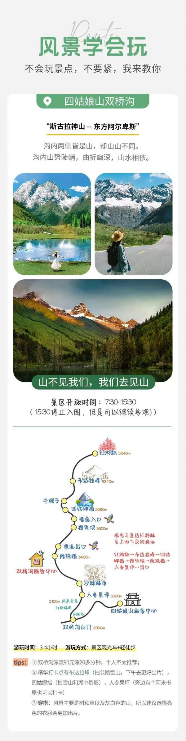 初到高原,建議緩步行走,適應高原氣候,尊重少數民族風俗習慣。因雙橋溝有限流要求,如遇票滿,我們將更換安排海子溝和長坪溝的門票,以上兩個景點也同屬四姑娘山。
