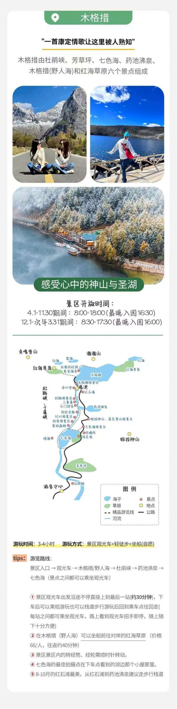 前往木格措景區,大概游玩3-4小時左右,景區內除可觀賞”臥虎觀月”、“石佛鎮海”等山景外,在各個季節的不同時辰還可觀賞到“雙霧墜?!?、“木格夕照”、“木格晨曦”、“木格潮汐”和迭瀑飛泉等云、霞、霧、水奇景,海濱珍珠沙灘可享沙浴、日光浴之樂。