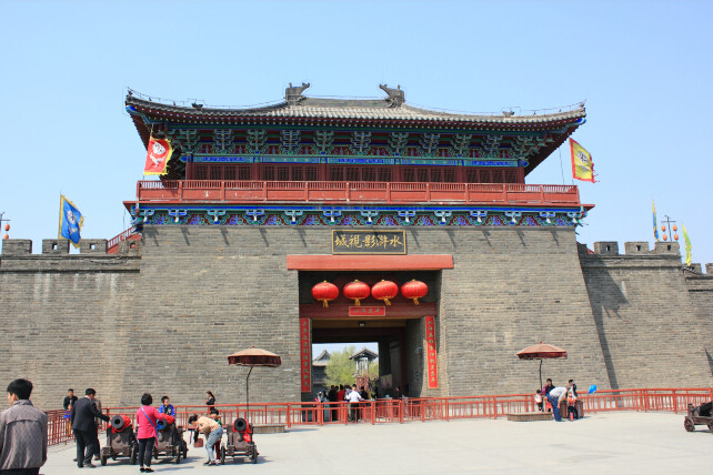 水滸影視城以《水滸傳》中描述的人物故事為背景,充分展現水滸故里歷史風貌和民俗人情,主要建設了王爺府、太師府、太尉府、青樓、樊樓、甕城、御龍坊、東京汴梁御道、紫石街等仿宋代建筑,古風濃郁,工藝精湛,細致逼真,進入城中,猶如跨入歷史;漫步城中,宛若暢游千年。