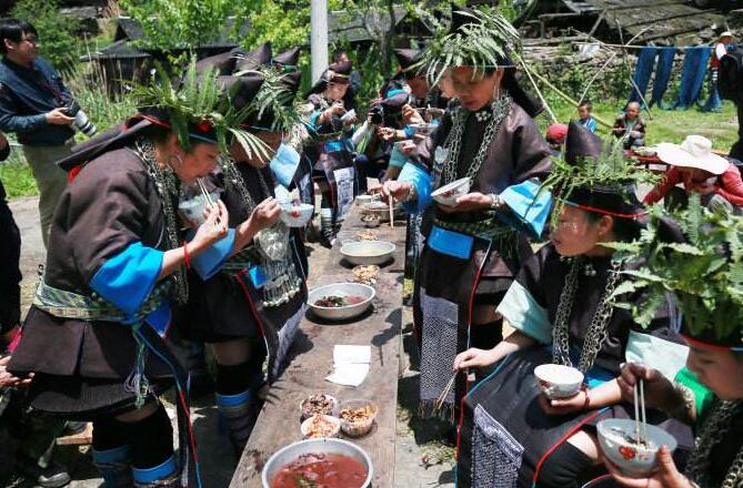 早餐后前往空申村寨依山而建,四周山巒起伏,林木蔥蔥,一條清澈的小溪從寨旁流過,民居布局合理,吊腳樓鱗次櫛比。這里最為世人矚目的是每年一度的“茅人節”。每年農歷二月至三月,成年男女青年不論年齡大小,結婚已否,凡自己樂意都可以任意找與自己情意相投的伴侶結隊到茅人坡扎茅人、對情歌、逗趣。特別意合情投者,則相互暗示,離群另尋靜處。節日氣氛熱烈、奔放、自由、浪漫。農歷三月三,被譽為“世界超短裙故鄉”的榕江縣兩汪鄉空申苗寨人山人海,熱鬧非凡,苗族同胞歡聚一堂,慶祝自己最古老的“情人節”——茅人節。茅人節(古老的苗族情人節)苗語為“撈沙麗”,又稱作“爬茅人坡”、“插茅人”。相傳,短裙苗族古時有本寨男女不通婚的習俗,婚姻由父母包辦,姑娘都要遠嫁他鄉,許多同寨青梅竹馬的男女不得不勞燕分飛。遠嫁的姑娘陽春三月均要返回娘家幫助春耕。勞作之余,她們便帶著“三月粑”邀約寨里的未婚姑娘和小伙子到山上唱歌,用歌聲抒發與心上人被迫分離,遠嫁他鄉的傷悲,并勸告未嫁的妹妹不要遠嫁,向情人傾訴內心深處的思念。唱到后來常常是淚水漣漣,泣不成聲。為了表達對家鄉和情人的依戀,她們用新的嫩綠枝葉和茅草扎成高低大小不等的“茅人”把,捆在杉樹桿上,然后插在最高的山頂上,一般插兩邊低排列,中間最高的象征大姐,兩邊低的為妹妹,寄予姐妹情意。我們結束游覽,返回榕江入住休息。
