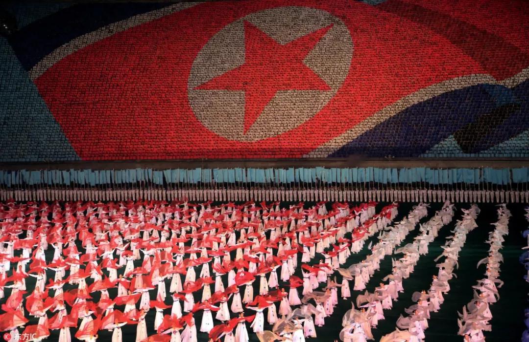 背景變換由朝鮮的小學生們手舉彩色翻板組成