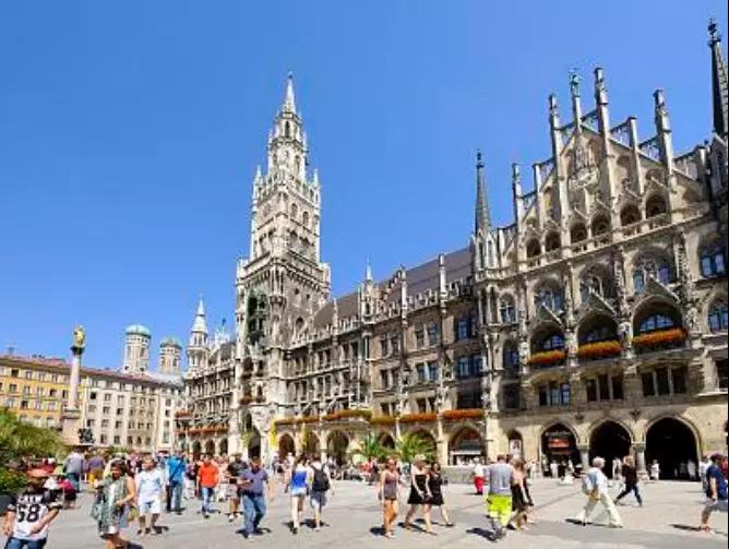 慕尼黑市中心的瑪麗恩廣場,裝飾富麗堂皇的新市政廳位于瑪麗亞廣場北側(cè),19世紀(jì)末建造的巍峨挺拔的棕黑色建筑,上面像撒了一層白霜。