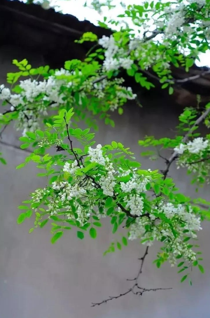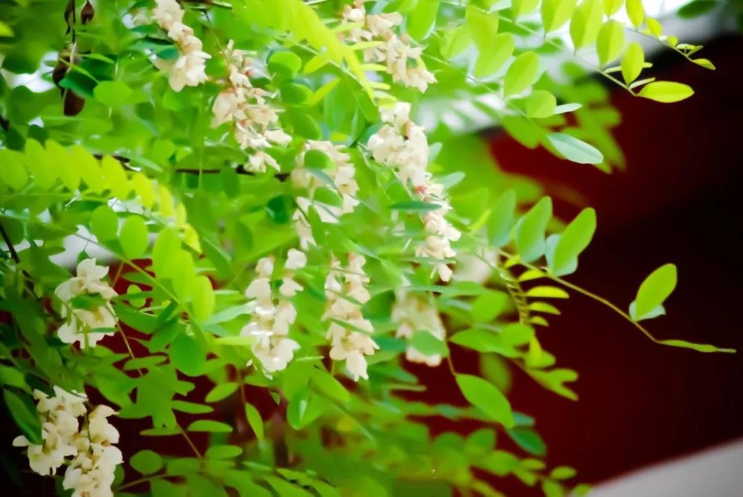 雪白的槐花和綠葉搖來搖去香雪似海