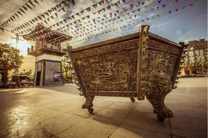 【九鼎廣場】是展示鼎文化的場所,廣場上每天舉行祭鼎活動和游客參與的歌舞活動。廣場上建有春秋樂宮,展示春秋時期的樂器,打造春秋音樂會。