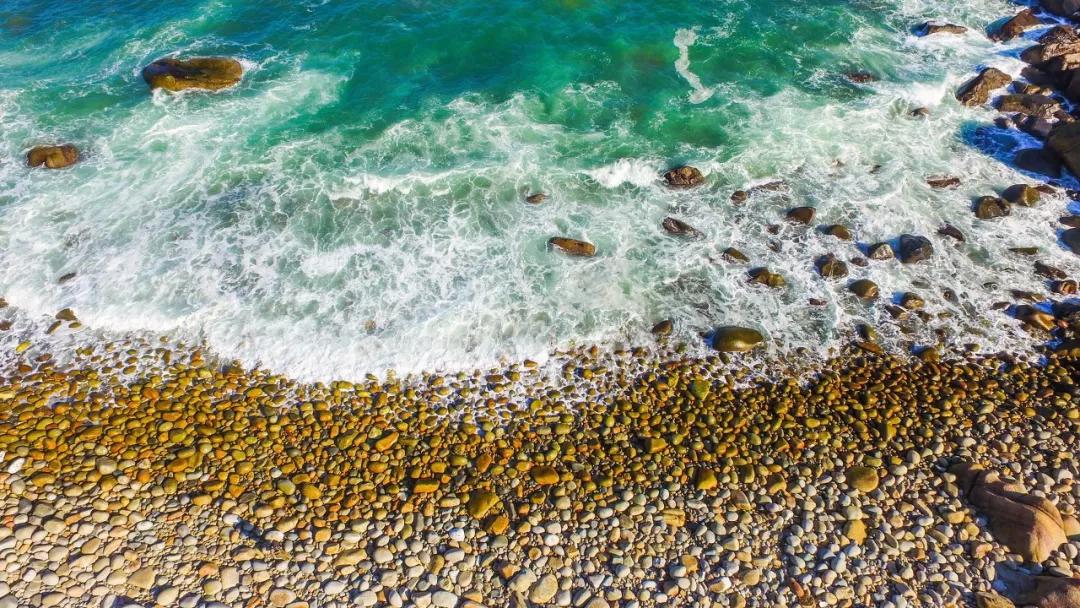 這里弓狀的數百米長的海灘上,沒有潔白的沙帶,人臨此境,首先內陸到湛藍的海水,再是密密麻麻的卵石。