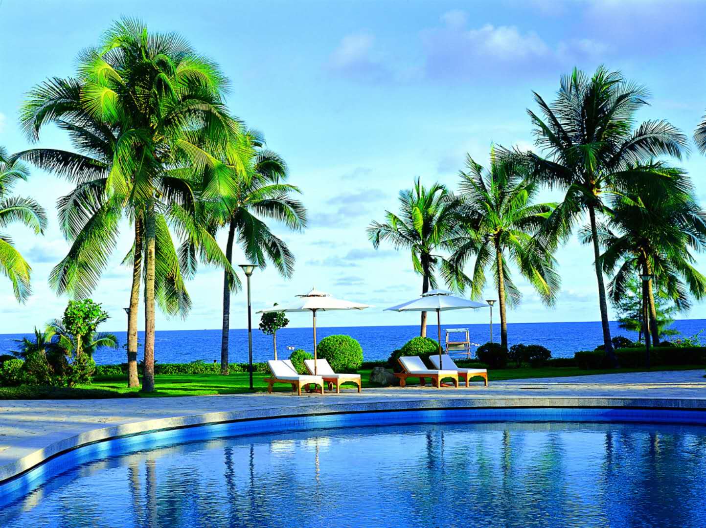 石梅灣是一片原始的南國景觀,三面環山,一面向海,山形秀美,石梅灣長長的海灘兩端,各向海中伸出兩座峰巒。