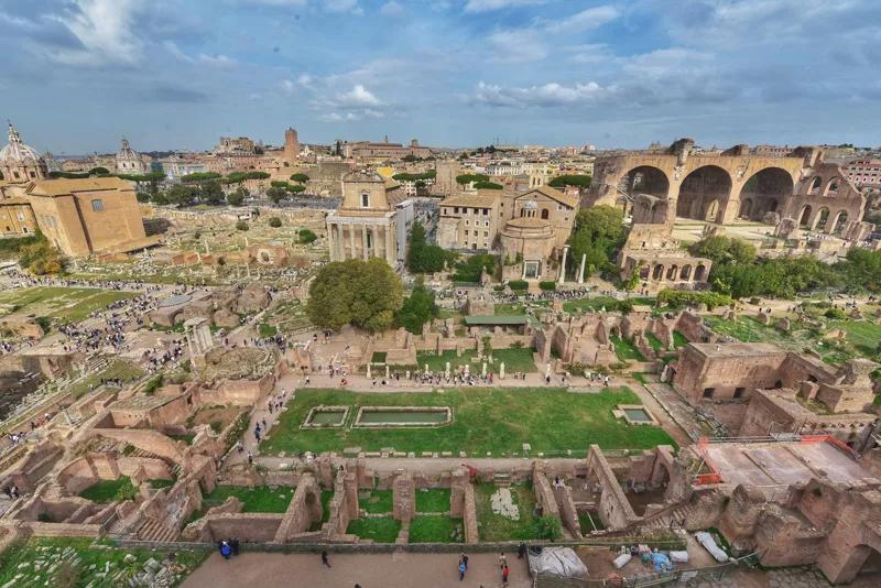 在帕拉蒂尼山上俯瞰羅馬,近處,古羅馬廣場為中心的古跡群曾是帝國最主要的核心區域。