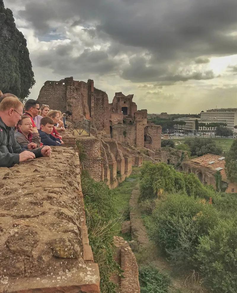 從帕拉蒂尼山俯瞰古羅馬遺跡的游客