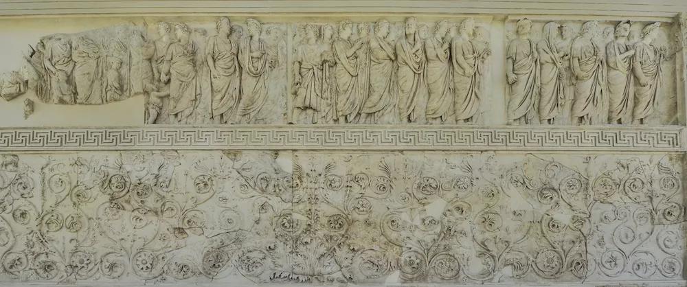 這是古羅馬最著名的紀念壇之一,壇壁上細膩的雕刻著這位偉大的帝王與他生命中最親密的一群人,他們姿態優雅的走在一列隊伍中,好似相扶攙扶,共同創造了那個偉大的時代。