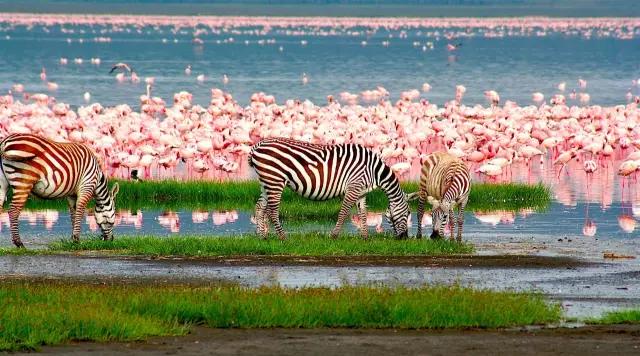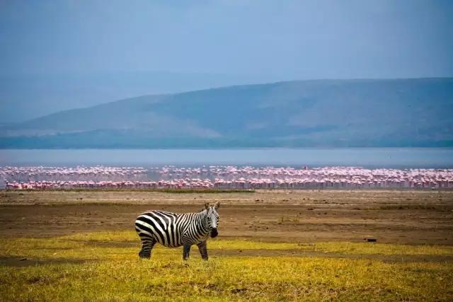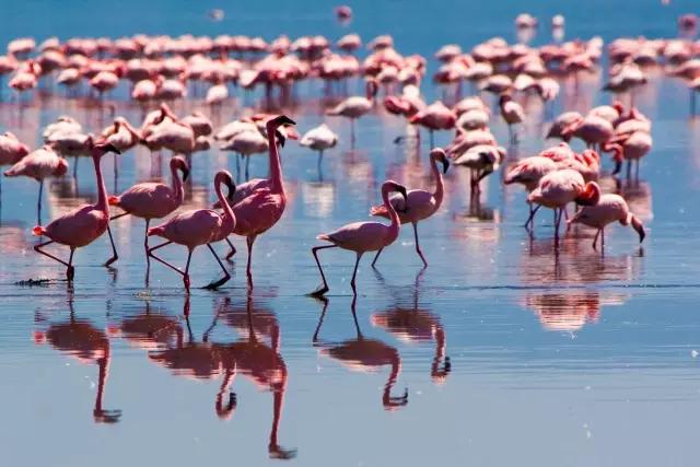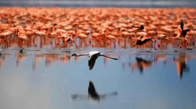 東非大裂谷猶如地球的傷痕,又好像是巨人的手筆,一連串蒸騰、冒泡的鹽堿湖沿著裂谷排開。別的生物都想遠離腐蝕性的湖水,但火烈鳥卻不怕,成千上萬只迅速將大地和湖泊染成了粉色。近距離觀察,這些粉色的家伙確實不算漂亮。不過,待到它們展開雙翅,從頭到腳都是紅與黑的變換,在青山綠水中立刻成為人們眼中的焦點。不過,近年來火烈鳥已經從納庫魯湖搬到了博戈里亞湖,想看 “紅云”的話,記得調整好你的行程。