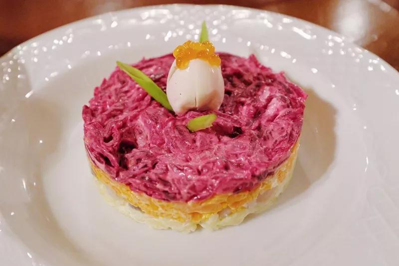在海外傳播最廣的俄式料理非紅菜湯莫屬,即我們熟悉的羅宋湯。紅菜湯最早起源于烏克蘭,隨著俄羅斯文化傳入中國后,卻變成了另一個版本。大多數紅菜湯都不放甜菜,而是加大量番茄和土豆。真正的紅菜湯要保留甜菜鮮艷的紫紅色,湯底則用牛肉經久熬成,需清澈入味,然后撒入新鮮蒔蘿,最后澆上一勺酸奶油才算完成。經典款前菜是生腌鯡魚沙拉,一種是鯡魚切片搭配土豆,脂肪感滿滿,帶有濃郁的咸腥味和一點酸味。若想再狂野一些,不如來份牛舌沙拉,搭配小龍蝦是點睛之筆,兩樣看起來風馬牛不相及的東西,居然完美融合。另一種版本顏值更高,吃起來也輕松許多,鯡魚、甜菜、土豆、胡蘿卜等都切粒后,一層層疊起來,變成色彩斑斕的圓柱形,澆上色拉醬,味道立刻小清新了。主菜不用說,罐燜牛肉會是最保險的選擇,各種香料和肉塊一起慢慢煨燉,直到香濃爛酥,濃濃的醬汁配上土豆、胡蘿卜等蔬菜一起吃,絕對是一道非常符合東方胃的西式菜。