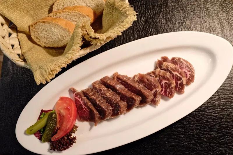 換個角度看,相比被各種加工食品和農藥蔬菜包圍的我們,西伯利亞土著們的飲食才是純正的有機天然,無需繁復的烹飪手段和調味方式,自然的即是最美味。在新西伯利亞市最熱門的Puppenhaus餐廳,一道擺盤極其簡陋的煙熏生腌牛肉令人回味無窮。牛肉厚切,脂肪與瘦肉的比例恰到好處,肉質柔軟緊實,微微呈紅褐色的肉片發出迷人的光澤,煙熏的風味沒有濃烈到臘香的程度,而帶有果木的清香。