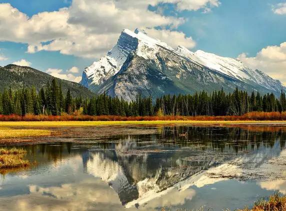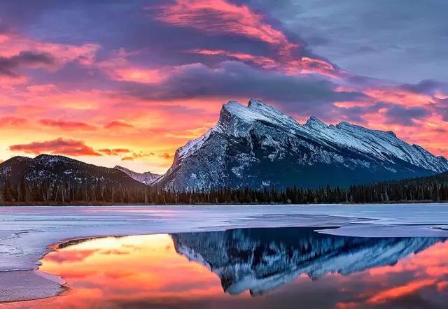 而畫面中如明鏡般純凈的美湖就是著名的朱砂湖(Vermilion Lakes)。朱砂湖距離班夫鎮3公里,此處是日出最漂亮的地方,也是整個落基山最富盛名的攝影地之一。