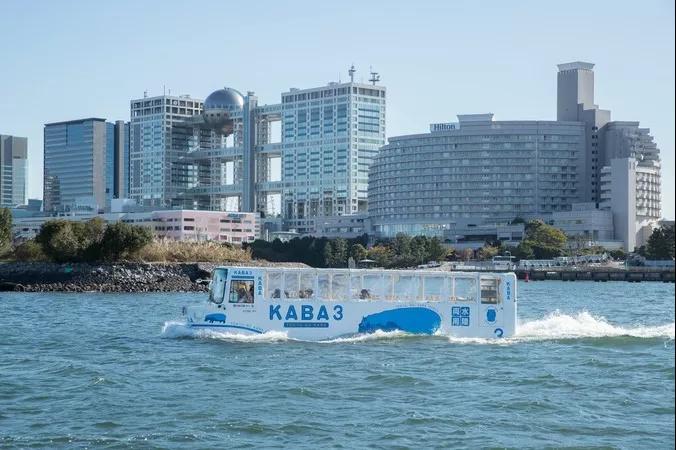 水陸兩用巴士TOKYO NO KABA,全長約12m,從臺場AQUA CITY的巴士站出發,一天有7班,每周三休息。該巴士可供38名游客乘坐,可以坐在上面一邊吹著海風一邊觀賞臺場的美景。需要提前一個月預約,如果當天有空位,沒有預約也可以乘坐。