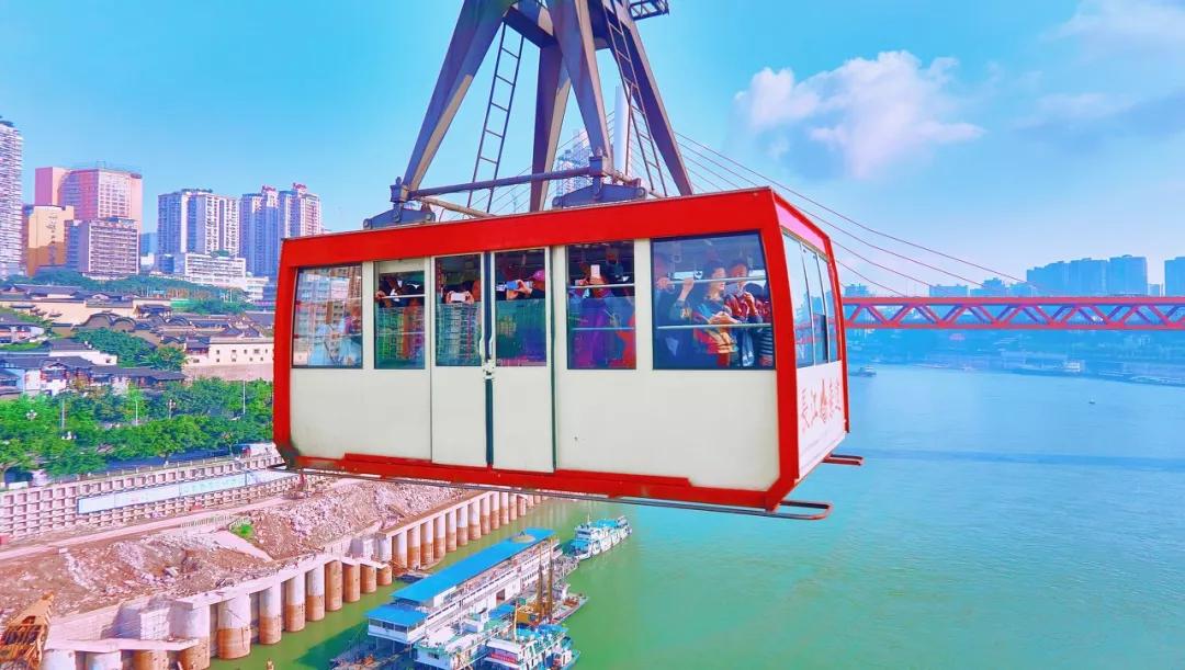 搭乘能容納50人的巨型“箱子”,腳下是濤濤的江水,身側是氣派的大橋,前方是林立的高樓,千余米的距離、5分鐘的時間,足以一窺山城的無限魅力。